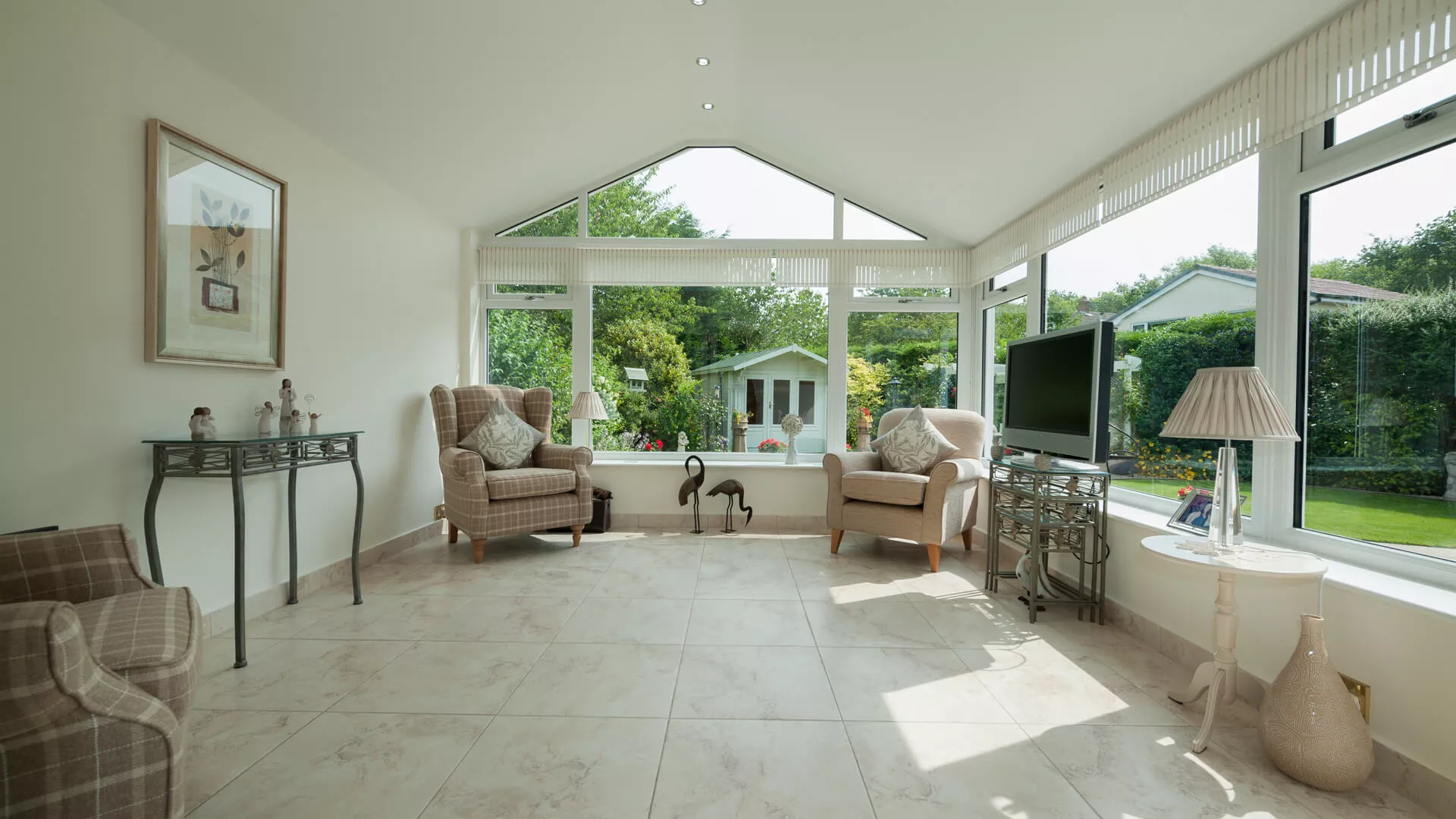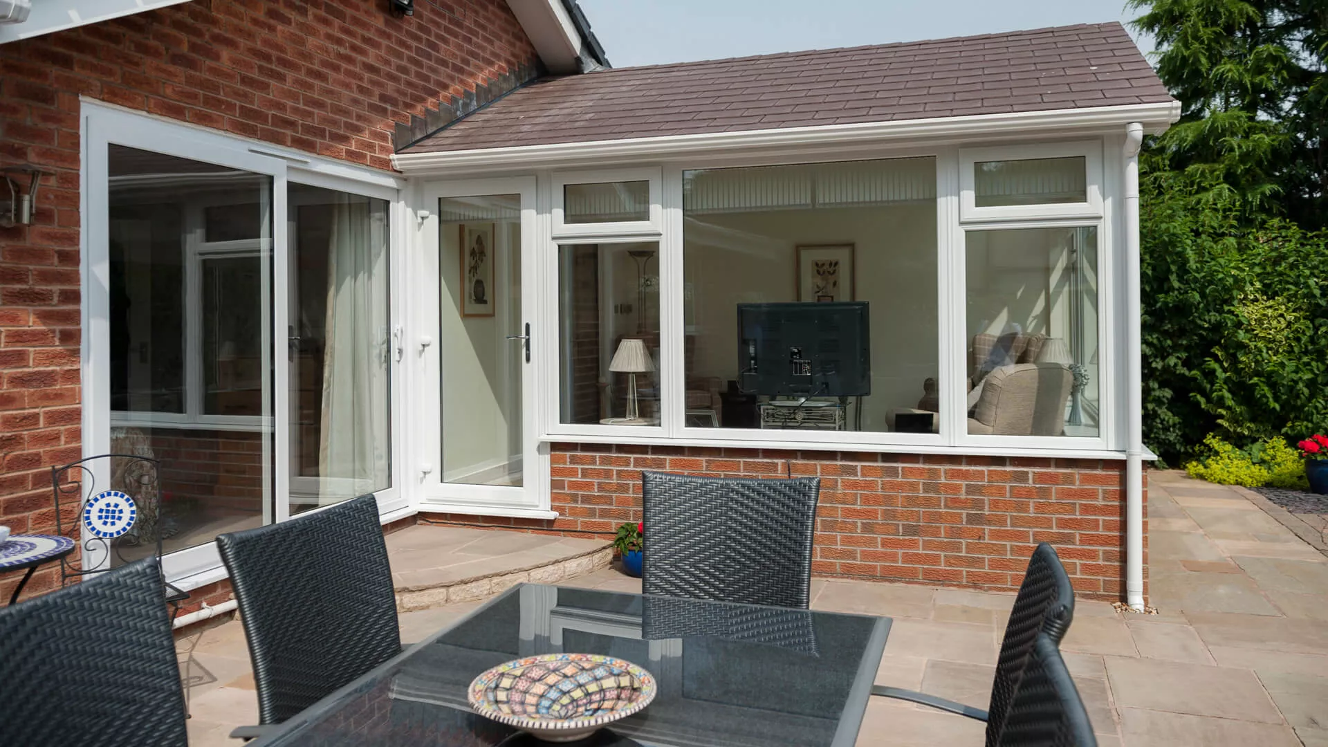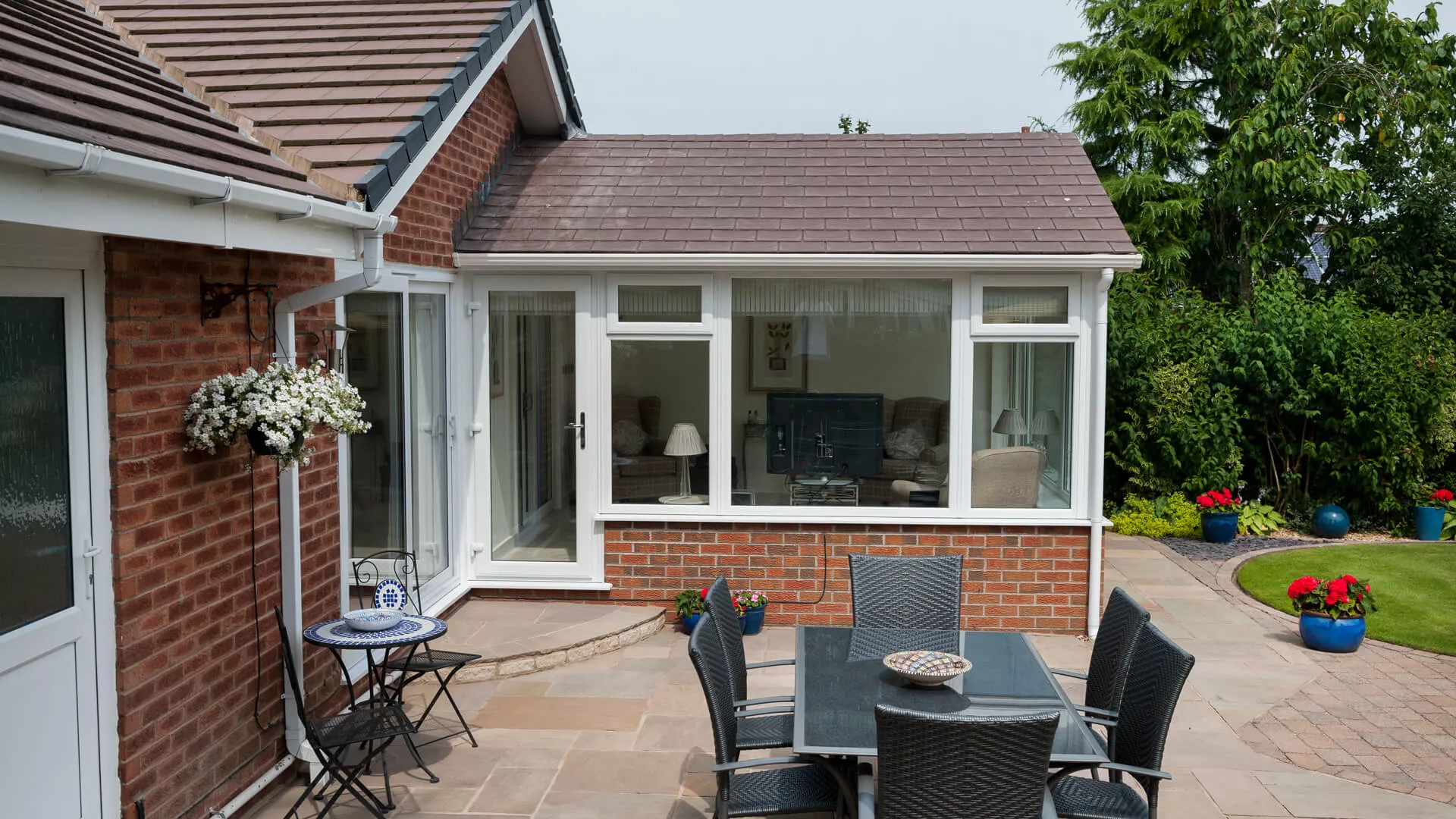 Moving from the conservatory to the patio is simple due to the side entrance and there’s also some patio doors waiting to be operated when anyone wants to go back into the house from the extension. Any night time lighting that’s required is driven into the space by the subtle downlighters which emphasise that cream / beige interior to the hilt. It’s like a whole new place now that we’ve worked our magic.